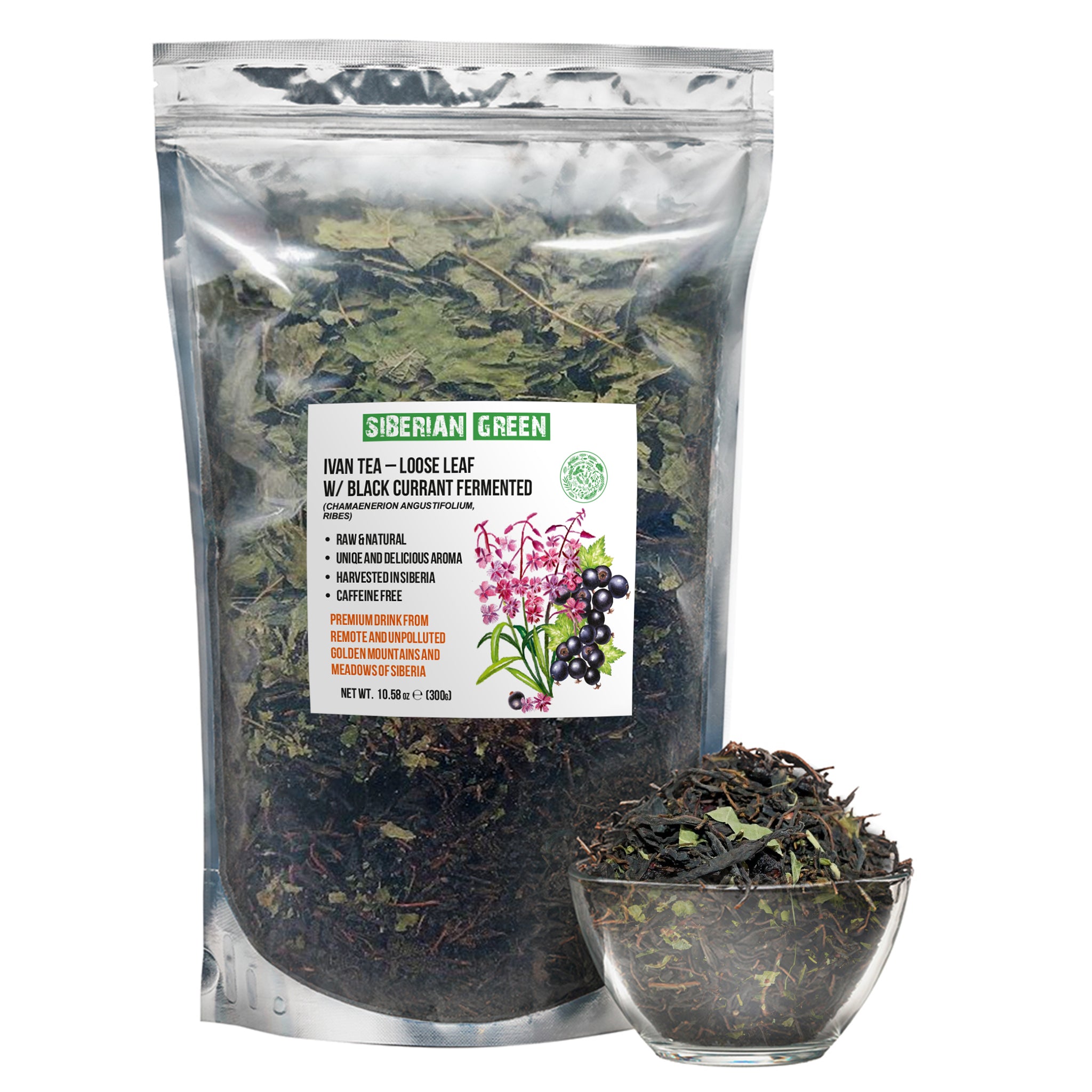 Experience the rich flavor and natural benefits of Siberian Green Ivan Tea with Black Currant – a fermented loose-leaf herbal tea made from wild-harvested Chamaenerion angustifolium (Fireweed) and enhanced with fragrant black currant leaves. Handpicked from the pristine Altai Mountains of Southern Siberia, this traditional Ivan Chai offers a smooth, slightly fruity taste and is completely free from caffeine, additives, and artificial flavorings.